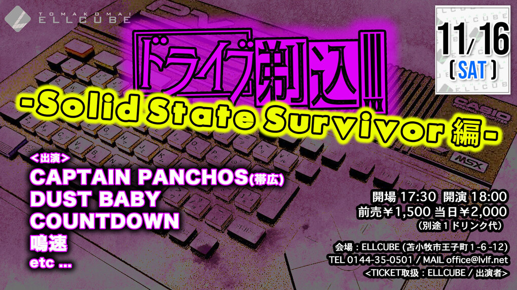 2024年11月16日(土) 苫小牧ELLCUBE ドライブ剃込!!! - Solid State Survivor 編 - 出演 ・CAPTAIN PANCHOS(帯広) ・鳴速 ・DUST BABY ・COUNTDOWN 他 OPEN 17:30 START 18:00 前売¥1,500 当日¥2,000 ※別途1D